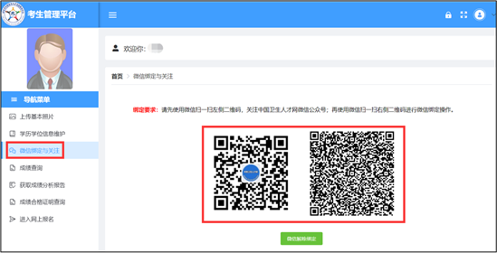 登录系统后,请通过【微信绑定与关注】功能绑定微信。